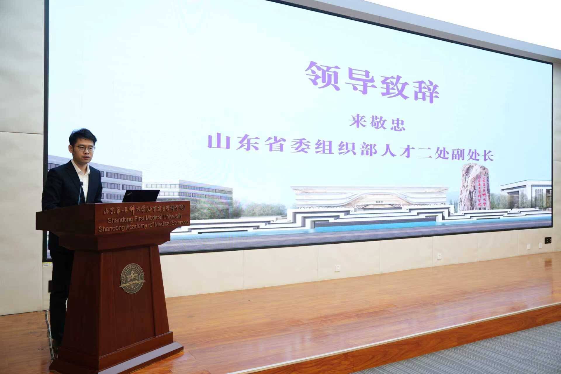 山东省委组织部人才工作二处副处长来敬忠,山东省教育厅高教处处长曾宪文,山东省科技厅人才处处长王婷,山东省卫健委人才与交流处副处长刘磊、科教处副处长孟勇,山东省医学会秘书长岳冬丽,济南国际医学中心副主任徐强,滨州医学院副院长于丽,康复大学副校长安琨,副校(院)长成敏、张继国等领导出席会议。会议由副校(院)长成敏主持。