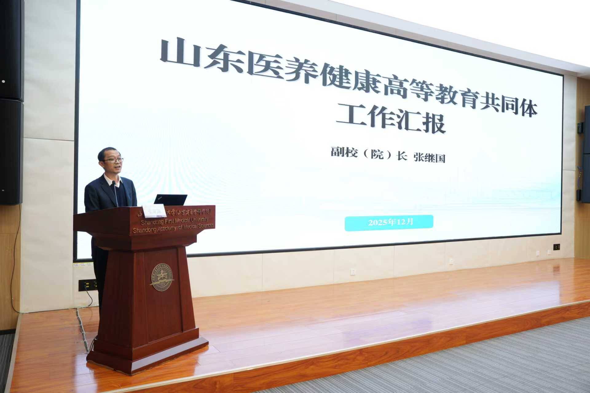 张继国代表共同体作了《山东医养健康高等教育共同体2025年度工作报告》。报告全面回顾了共同体成立以来在课程建设、学生培养、人才引育、技术攻关、成果转化等方面的工作成效,系统梳理了“学科交叉、智慧教育、人才引育、技术攻坚”等领域的建设成果。