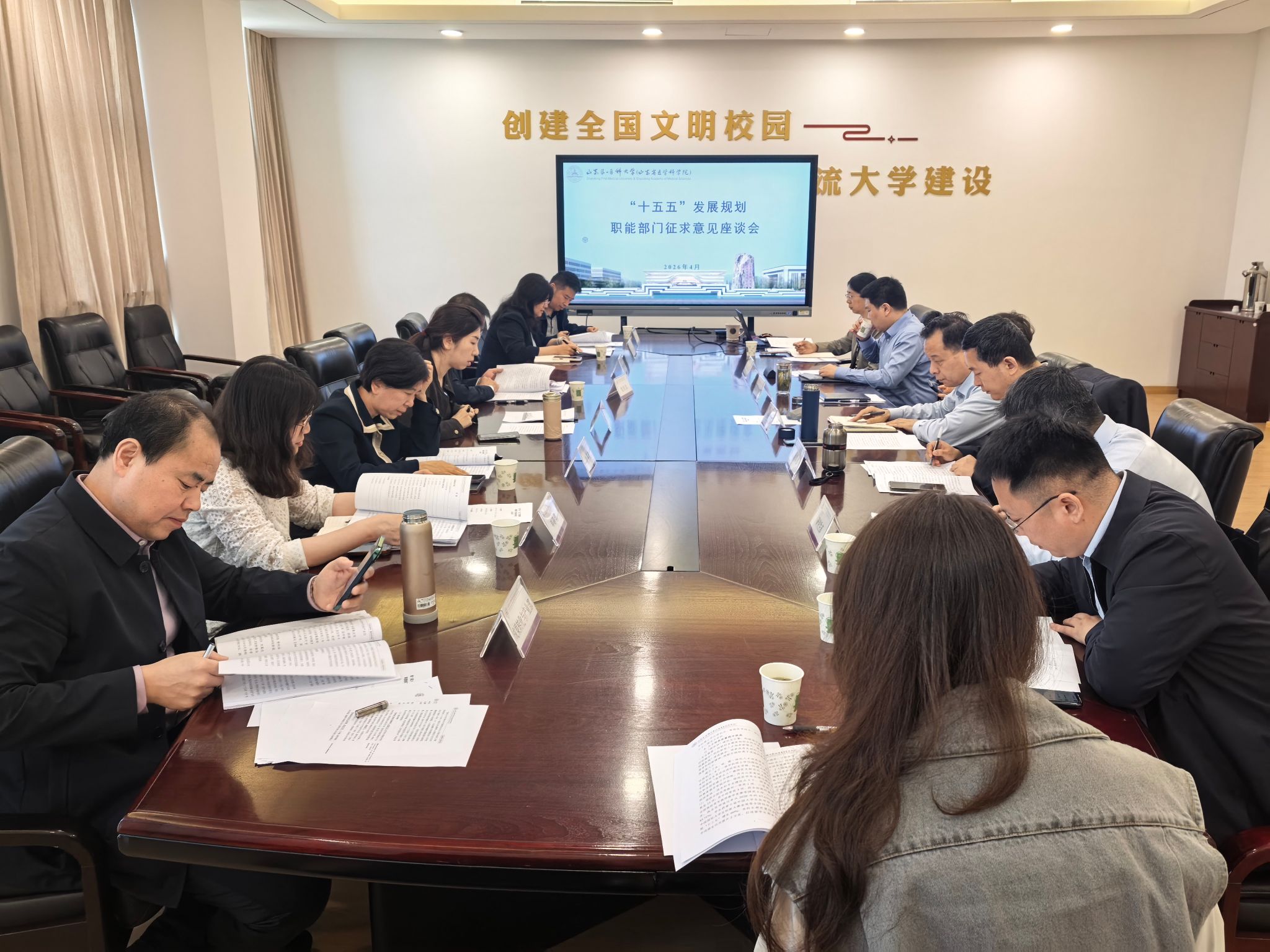 会上,与会人员认真审阅了《山东第一医科大学(山东省医学科学院)“十五五”发展规划(2026-2030)(征求意见稿)》。各部门负责人立足校(院)发展大局,结合本部门核心业务和牵头工作,围绕发展目标、重点任务、关键指标、改革举措和保障措施等方面进行了深入的交流研讨,提出了具体务实的意见建议,为进一步完善规划文本提供了重要参考。会议指出,“十五五”时期是校(院)实现跨越式发展的关键五年,编制一部高质量的发展规划至关重要。会议要求,各部门要以高度的责任感和使命感,继续深入思考,将好的意见建议充分吸收到规划文本中,使规划更具前瞻性、科学性和引领性。